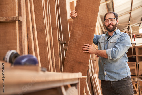 Schreiner oder Tischler im Holzlager mit Werkstück