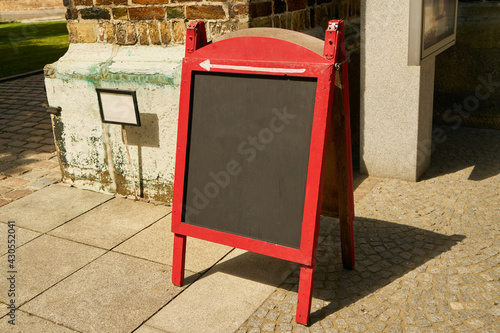 Wooden frame chalkboard standing outdoors near a cafe on a stone street