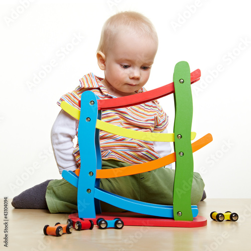 Kind mit Spielzeugauto am Looping  einer Rennbahn
