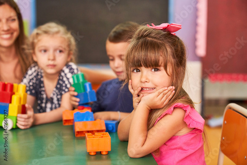 Kinder spielen in Kita oder Hort mit Erzieherin