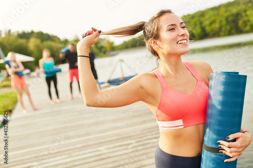 Attraktive und sportliche junge Frau mit Yogamatte