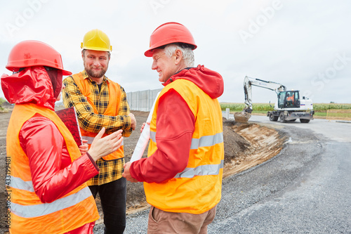 Bauleiter und Vorarbeiter mit Bauzeichnung auf Baustelle