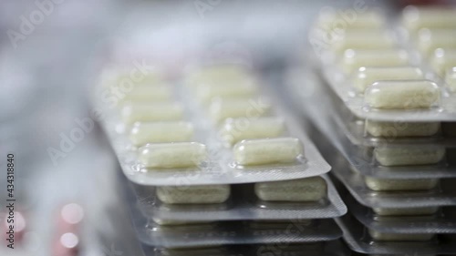 Closeup of pile of pills in blisters rotating counterclockwise in a loop