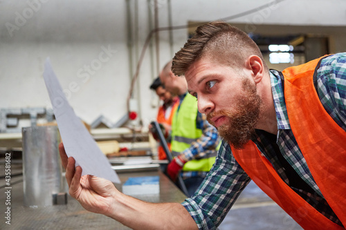 Arbeiter liest Zettel mit einer Bestellung in der Werkstatt