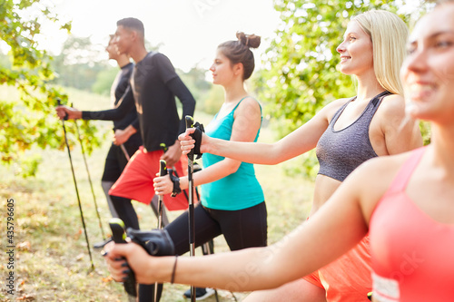Freunde als Nordic Walking Gruppe beim Training in Natur