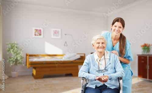 Seniorin im Rollstuhl mit Pflegekraft im Pflegeheim
