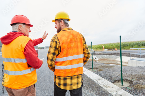 Zwei Bauarbeiter besprechen Ausbau der Straße