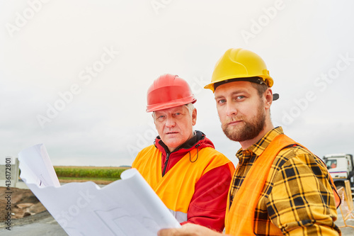 Zwei Bauarbeiter schauen auf eine Bauzeichnung