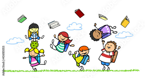 Glückliche Schulkinder mit Schulranzen und Büchern