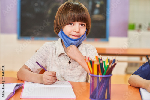 Boy with mask because of Covid-19 as a student in class
