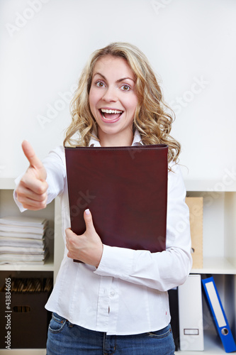 Frau mit Bewerbungsmappe hält Daumen hoch