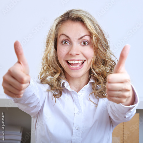 Jubelnde Geschäftsfrau hält Daumen hoch