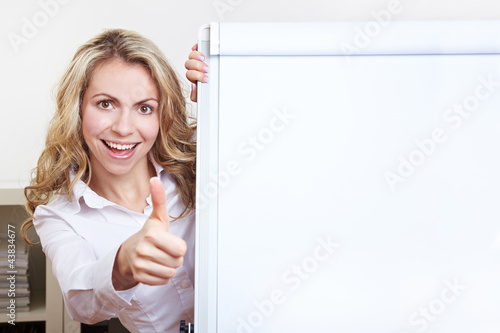 Jubelnde Geschäftsfrau hält Daumen hoch