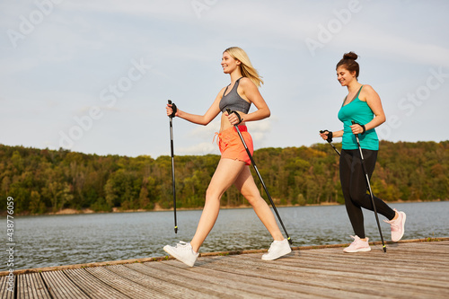 Junge Frau mit einer Freundin beim Nordic Walking