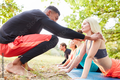 Trainer im Yoga Kurs hilft bei der Dehnübung