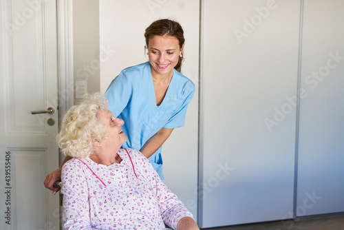 Freundliche Altenpflegerin und Seniorin im Rollstuhl
