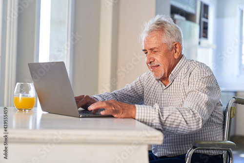 Seniorin im Rollstuhl am Laptop Computer beim Videochat