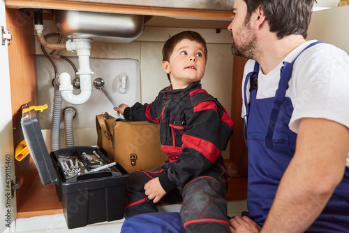 Child helps father repair the sink