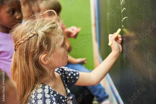 Girl paints with chalk on the preschool blackboard