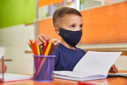 Boy with mask because of Covid-19 as a student in class