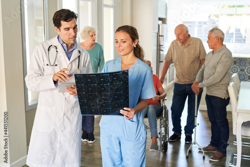 Arzt mit Tablet Computer und Senior Patientin mit Mundschutz