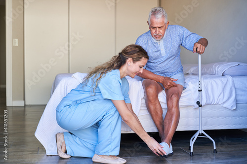 Altenpflegerin hilft Senior beim Schuhe anziehen