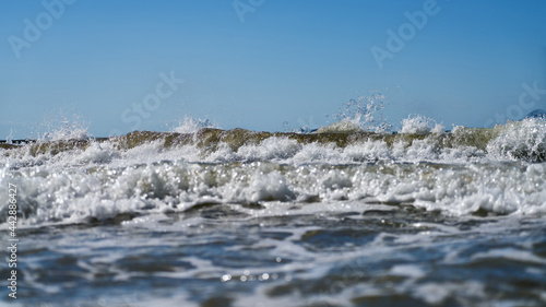 Welle mit Gischt und Spritzern Wasser im Meer vor Himmel