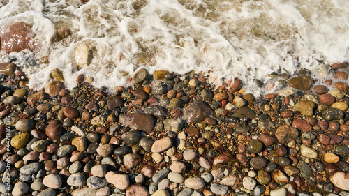 Wellen spülen Wasser über Steine und Kiesel am Strand