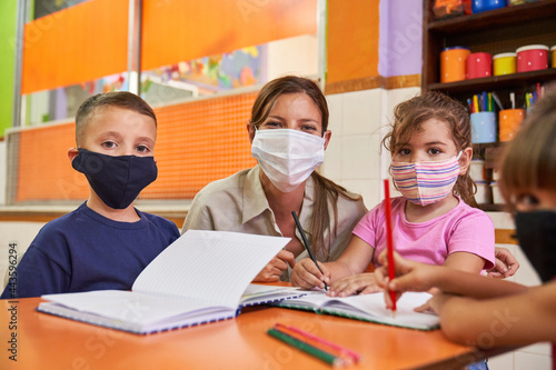Kindergärtnerin und Kinder mit Mundschutz in Vorschule
