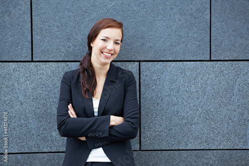 Zufriedene Geschäftsfrau lehnt an Mauer