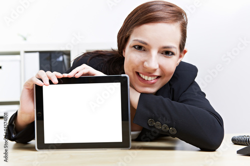 Geschäftsfrau versteckt sich hinter Tablet Computer