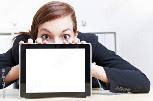 Geschäftsfrau versteckt sich hinter Tablet Computer