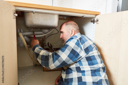 Klempner bei der Montage vom Abfluss der Küchenspüle