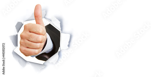Geschäftsfrau zeigt Daumen hoch durch Riss im Papier