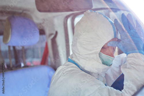 Exhausted paramedic from the emergency services takes a break in the ambulance