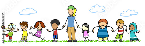 Cartoon Frau als Erzieherin im inklusiven Kindergarten