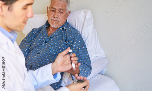 Pfleger oder Pflegehilfe beim Blutzucker messen von Senior