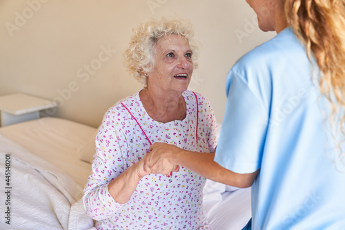 Altenpflegerin hilft alter Frau beim Aufstehen vom Bett
