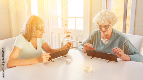 Zwei alte Frauen spielen Rummikub im Seniorenheim