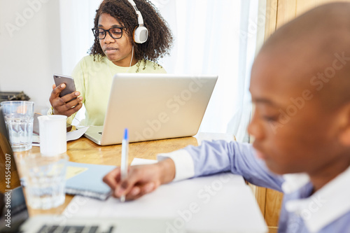 Frau im Homeoffice und Kind als Schüler beim Homeschooling