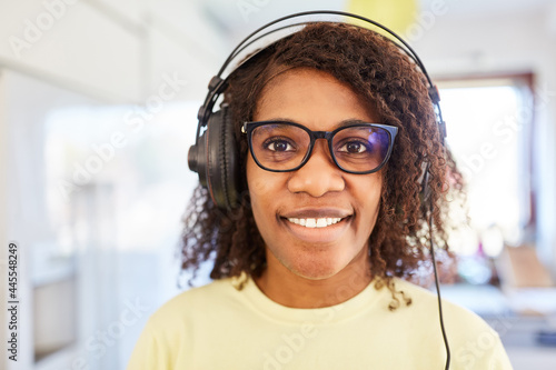 Afroamerikanische Studentin mit Kopfhörer beim Fernstudium