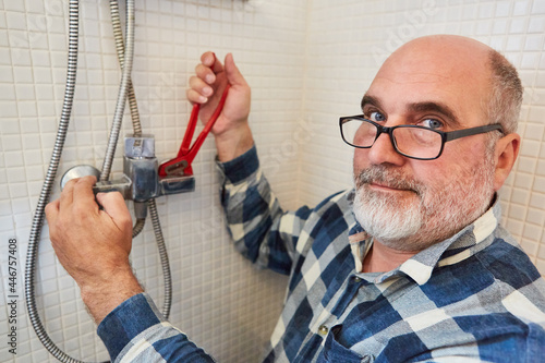 Heimwerker mit Rohrzange montiert neuen Brauseschlauch