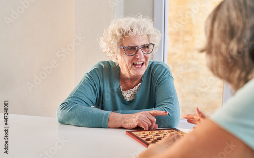 Zwei alte Frauen spielen Rummikub im Seniorenheim