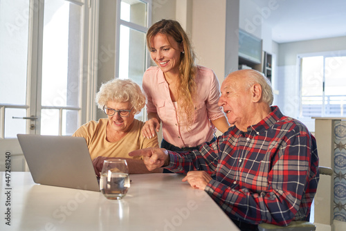 Tochter hilft Senioren Eltern mit Laptop Computer