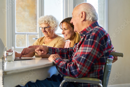 Seniorin im Rollstuhl am Computer macht einen Video Call