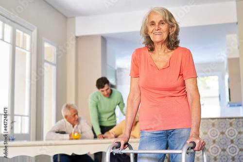 Altenpflegerin spricht mit einem Senior mit Rollator