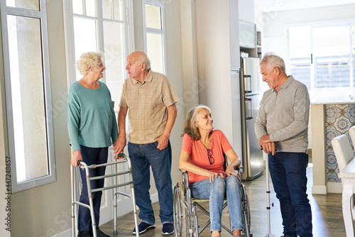 Group of seniors with wheelchairs and walking frames in the retirement home