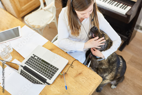 Frau im Rollstuhl im Homeoffice krault ihren Assistenzhund