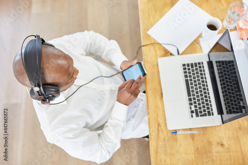 Mann mit Kopfhörer und Smartphone bei einer Videokonferenz