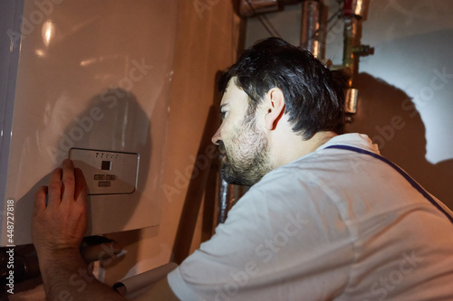 Heizungsinstallateur kontrolliert die Gastherme im Keller